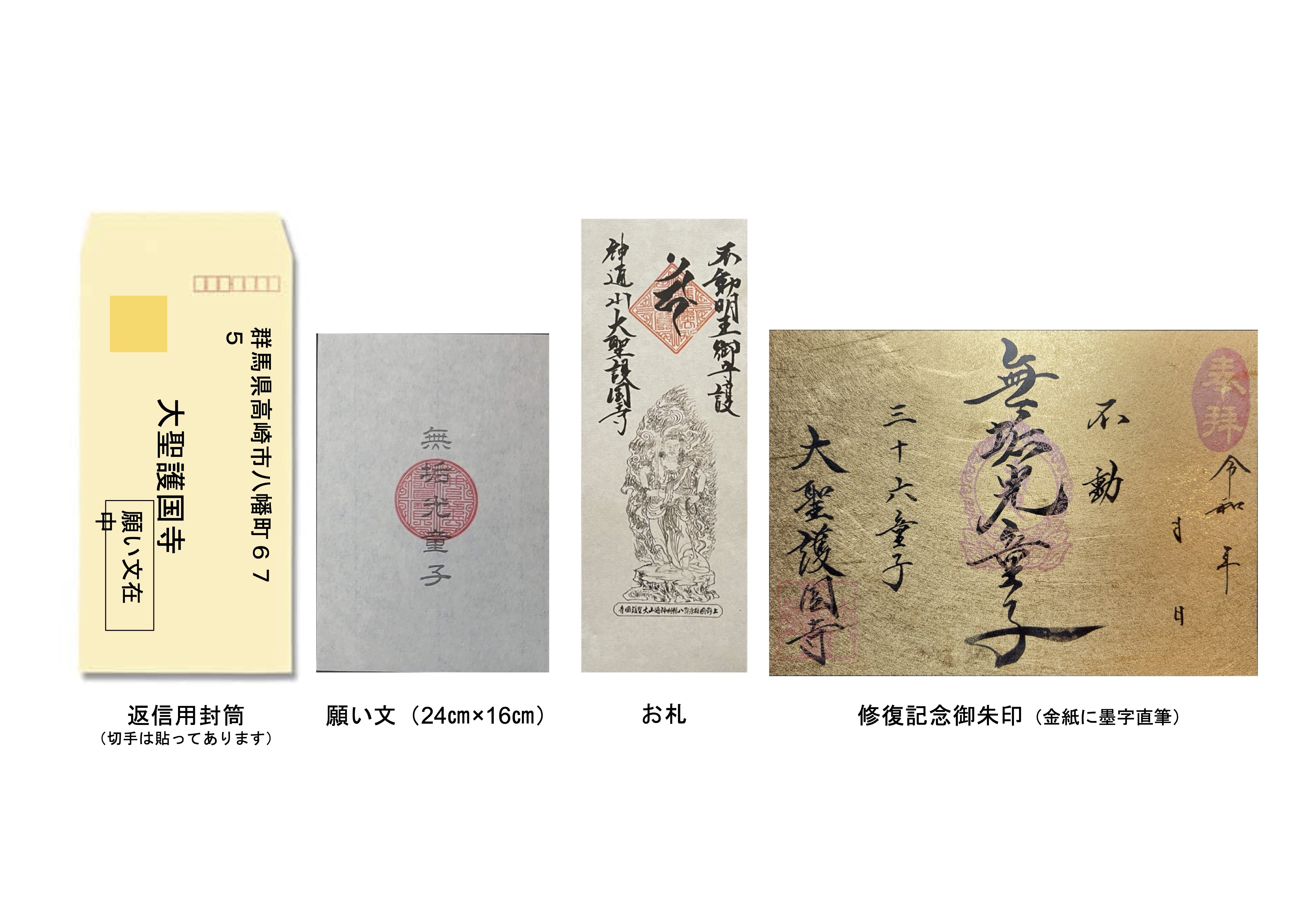 「願い文(ぶみ)」を同封されている大聖護国寺宛の封筒の中に入れそのまま投函してください。切手は貼ってあります。お寺に届きましたら確認のお葉書をお送りいたします。