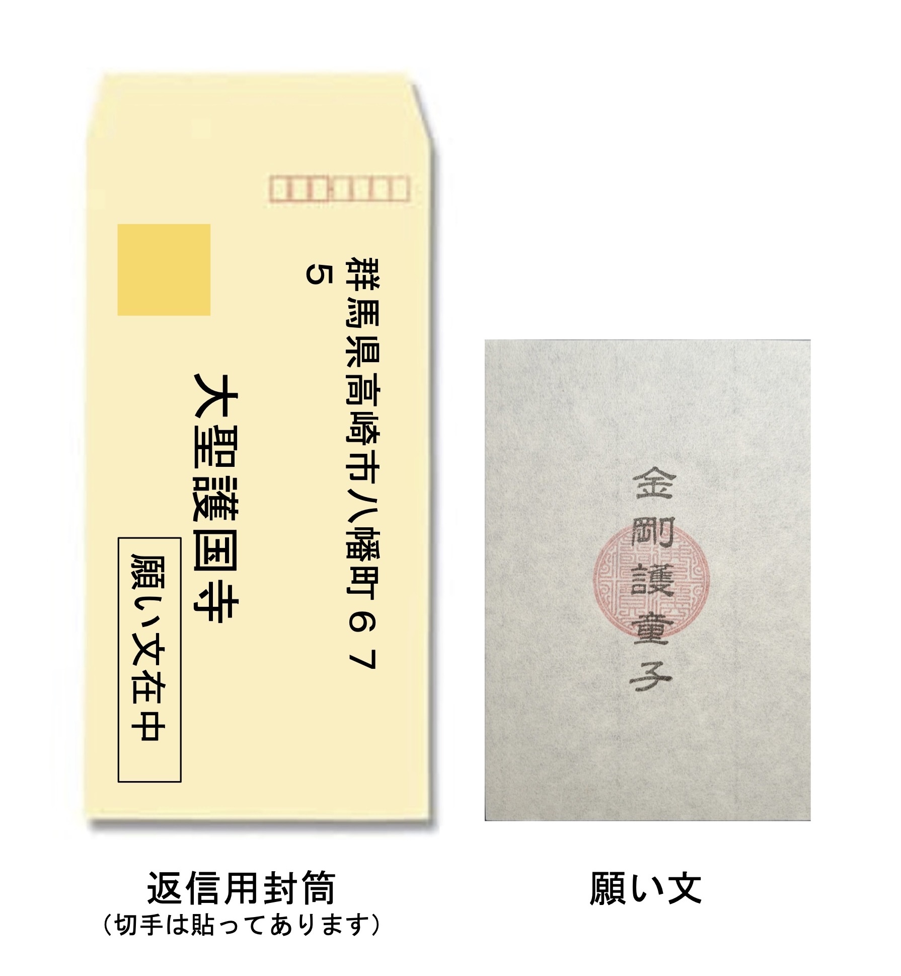「願い文(ぶみ)」を同封されている大聖護国寺宛の封筒の中に入れそのまま投函してください。切手は貼ってあります。お寺に届きましたら確認のお葉書をお送りいたします。